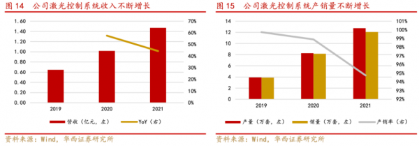 高精密振鏡控制系統(tǒng)深耕多年,營收不斷增長。2019-2021年公司激光加工控制系統(tǒng)的營業(yè)收入分別為0.65億元、1.02億元和1.47億元,呈現(xiàn)快速增長態(tài)勢;激光加工控制系統(tǒng)銷量較上期同比增長52.94%、109.32%、47.89%,產(chǎn)品銷量大幅增長。同時,公司通過價格調(diào)整、開發(fā)新產(chǎn)品等方式擴大銷量。