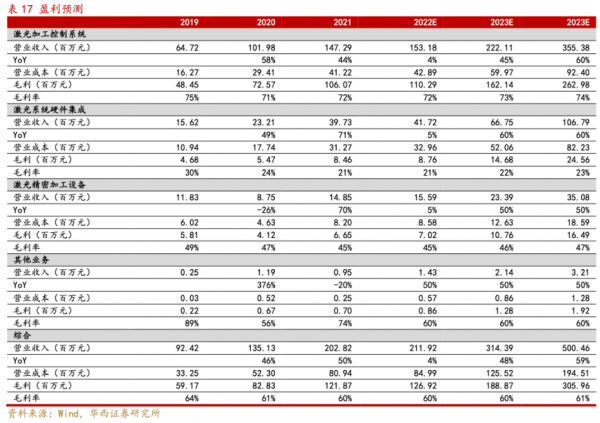 2022年激光行業(yè)整體承壓,或?qū)臼杖攵嗽斐梢欢ㄓ绊憽?022-2023年通用行業(yè)復蘇預期強烈,疊加公司不斷拓展新的產(chǎn)品與行業(yè),各個業(yè)務板塊有望恢復高增,毛利率水平也有望維持較好的水平且略有提升。