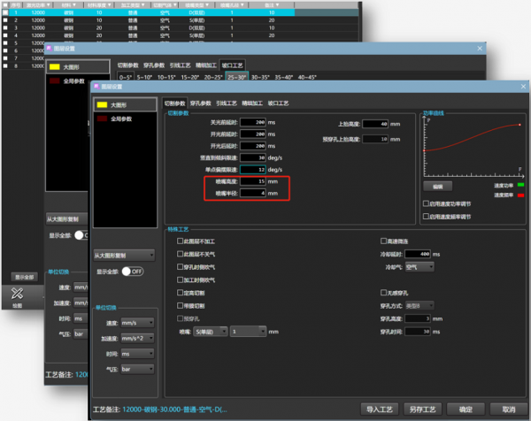 坡口專屬工藝庫管理 坡口專屬工藝庫管理,支持坡口高度、噴嘴半徑設置;自動補償,無需二次測量,大大提高效率,節約資源。