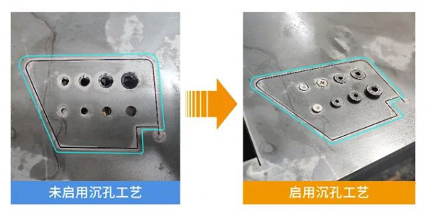 沉孔工藝 免去傳統的沉孔工序,一步到位加工出錐形沉孔,大大提升加工效率,同時可在坡口不能切小孔場景時使用。