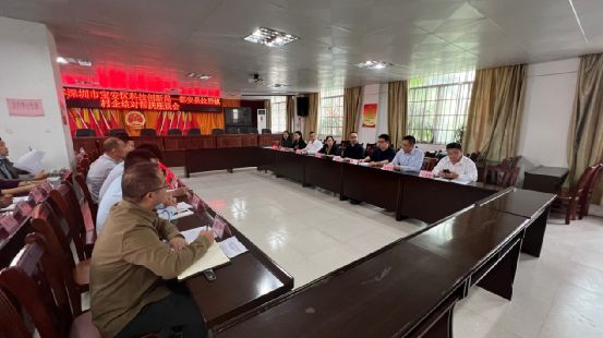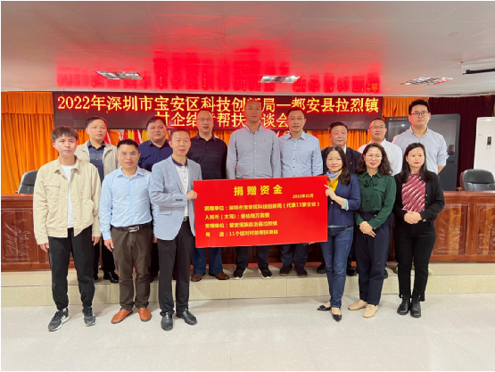 深圳市寶安區(qū)科協(xié)秘書長、寶安科技館張小萍館長(牌右)代表愛心企業(yè)向拉烈鎮(zhèn)黨委書記唐斌(牌左)捐贈幫扶資金;自治縣黨委常委、副縣長譚意浩(后中) 到會祝賀