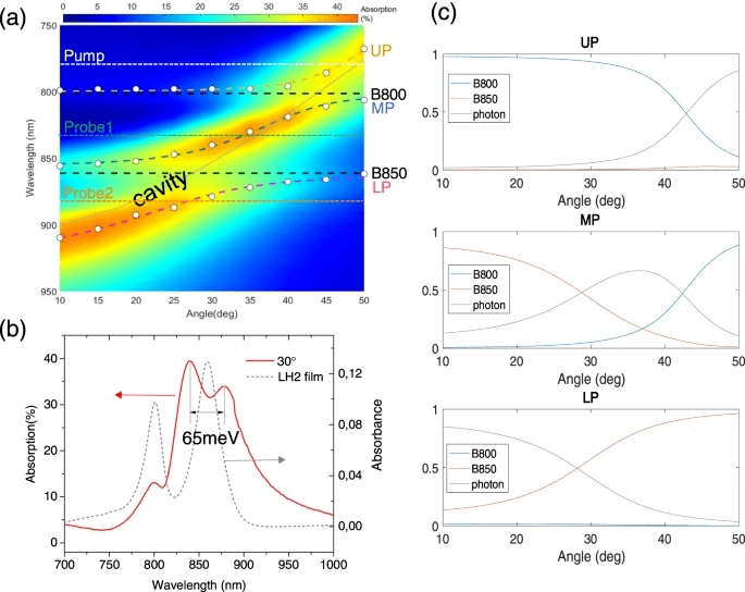 通過(guò)監(jiān)測(cè)腔的色散行為,并將其與蛋白質(zhì)中被激發(fā)的躍遷能量相關(guān)聯(lián),驗(yàn)證了實(shí)驗(yàn)中產(chǎn)生的強(qiáng)耦合機(jī)制。根據(jù)該項(xiàng)目的論文,由于LH2中極化子狀態(tài)的產(chǎn)生,激子動(dòng)力學(xué)發(fā)生了實(shí)質(zhì)性的變化。
