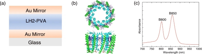 上圖a:半透明的Fabry-Pérot腔結(jié)構(gòu),其中兩個(gè)Au反射鏡(厚度22 nm)夾在含有LH2(厚度300 nm)的PVA薄膜中; 圖b:嗜酸Rhodoblastus ophilus菌株10050的LH2復(fù)合物的結(jié)構(gòu),垂直于膜平面的視圖(上)和復(fù)合物的側(cè)視圖(下),其中緊密排列的B850環(huán)為藍(lán)色,松散排列的B800環(huán)為淡紫色,類胡蘿卜素鏈為棕色,α-載脂蛋白鏈為青色,β-載脂蛋白鏈為綠色;圖c:玻璃襯底上LH2裸膜的穩(wěn)態(tài)吸收,其中B800和B850吸收峰被很好地分解。