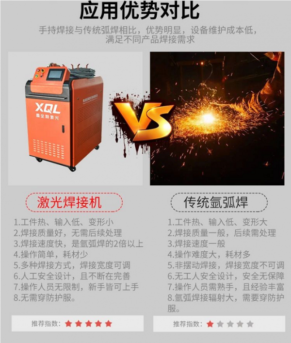 焊接效果對比:激光手持焊可完成異種鋼和異種金屬焊接。速度快,變形小,熱影響區小。焊縫漂亮、平整、無/少氣孔,無污染。手持式激光焊接機可進行微小開型零件和精密焊接。