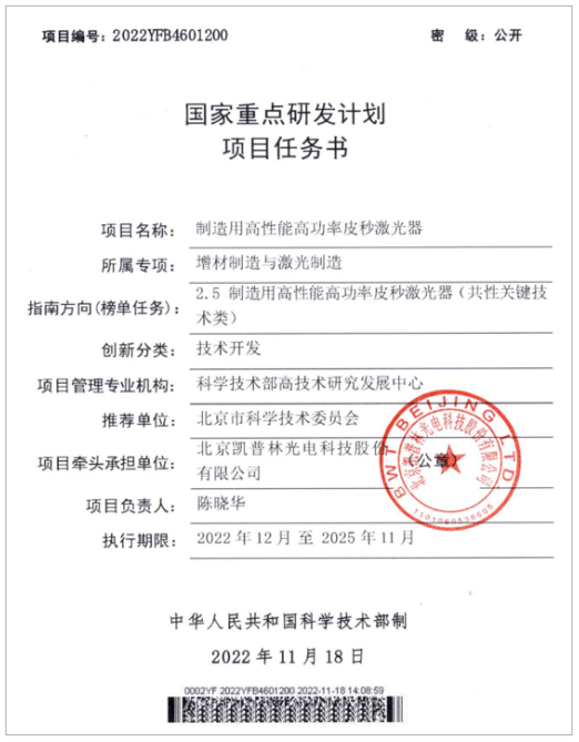 近日,科技部“十四五”國家重點研發計劃“增材制造與激光制造”重點專項立項通過公示。由凱普林董事長陳曉華作為項目負責人牽頭申報的“制造用高性能高功率皮秒激光器”項目獲科技部立項資助。項目聯合中國科學院空天信息創新研究院、蘇州中輝激光科技、中國科學院半導體研究所、寶山鋼鐵、杭州拓致光電科技等優勢單位合作開展研究。這是繼今年年初凱普林擔任國家某重點領域項目負責單位之后,又一次牽頭負責國家重點研發計劃項目。