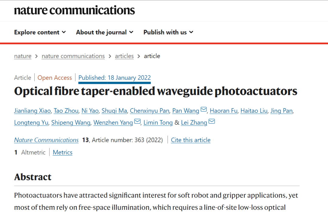 1月18日,《自然通訊》(Nature Communications)刊發了之江實驗室最新研究成果“基于微納光纖的光波導型軟體光致動器”(Optical fibre taper-enabled waveguide photoactuators),展示了提升光致動器變形性能的新思路。之江實驗室類人感知研究中心肖建亮博士為論文第一作者,之江實驗室類人感知研究中心張磊教授、楊文珍教授,浙江大學王攀研究員為共同通訊作者。