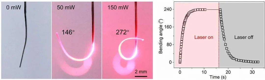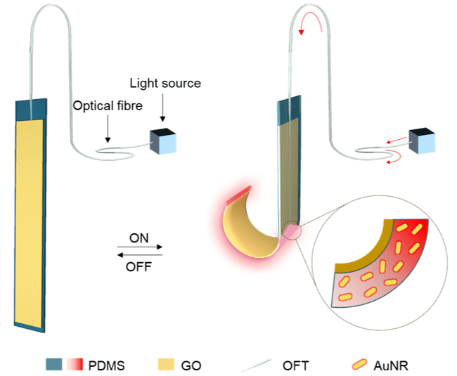 肖建亮介紹,微納光纖的微小尺寸,加上光響應材料的光熱效應和熱膨脹系數不匹配機理是“破題”的關鍵。“微納光纖擁有納米級尺寸,令光致動器的厚度降至70微米,更加柔軟靈活。同時,更小的直徑提高了能量密度和利用率,可以顯著提升致動器變形能力?!?/p>