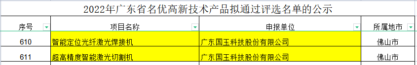 近日,廣東省高新技術(shù)企業(yè)協(xié)會(huì)公布了《關(guān)于2022年廣東省名優(yōu)高新技術(shù)產(chǎn)品評(píng)選擬通過(guò)名單的公示》,遴選出一批創(chuàng)新能力突出、技術(shù)先進(jìn)、質(zhì)量可靠、市場(chǎng)前景好的產(chǎn)品。其中,由廣東國(guó)玉科技股份有限公司(下稱“國(guó)玉科技”)自主研發(fā)的“智能定位光纖激光焊接機(jī)”和“超高精度智能激光切割機(jī)”兩款產(chǎn)品,憑借其突出的科技創(chuàng)新能力和領(lǐng)先的技術(shù)指標(biāo)等綜合優(yōu)勢(shì),榮譽(yù)上榜,名列其中。