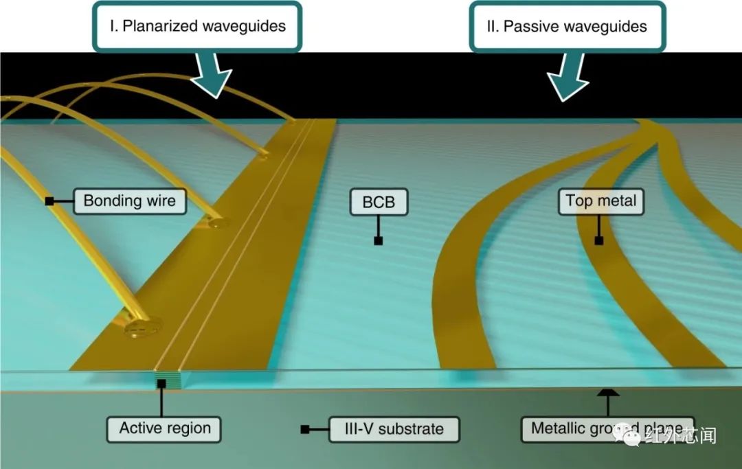 但在該團隊設計的集成光學平臺中,這些問題都已經被解決。他們將接合線放置在無源、苯并環丁烯覆蓋區域上方的金屬頂部,有效避免了在有源區頂部形成任何缺陷,并且能夠制造非常窄的波導,遠低于接合線尺寸。窄波導寬度可以用作基本橫向激光模式的有效選擇機制,并且也有利于散熱和高溫連續波操作。