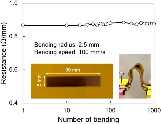 圖8:在25 μm PI上制備了尺寸為5 × 30 mm2的方形銅,并在自制的彎曲機上進行了彎曲試驗。經過1000次彎曲(彎曲半徑為2.5 mm)后,試樣的電阻由0.87變為~ 0.88 Ω/mm,如圖8所示。激光燒結銅在多次彎曲作用下電阻的變化。彎曲速度為100mm /s,彎曲半徑為2.5 mm。