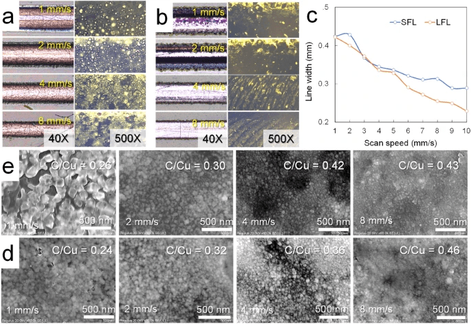 激光照射時間與3D打印機所附激光模塊的掃描速度(或速度)直接相關。研究人員在38%的功率輸入和預定的焦距下增加掃描速度,同時檢查了Cu模型。在圖5a中,LFL的情況清楚地表明,在低掃描速度下,Cu的粒徑增大,線寬隨著掃描速度的增加而減小。圖5b中SFL的線寬也有類似的減小,但線寬變化率比LFL低(圖5c)。圖5d-e中SFL和LFL的SEM圖像與顯微鏡圖像相吻合,可見隨著掃描速度的降低,Cu的粒徑逐漸增大。分析表明,隨著掃描速率的增加,Cu圖譜中的C含量增加。基于這些結果,確定掃描速度為4mm /s。