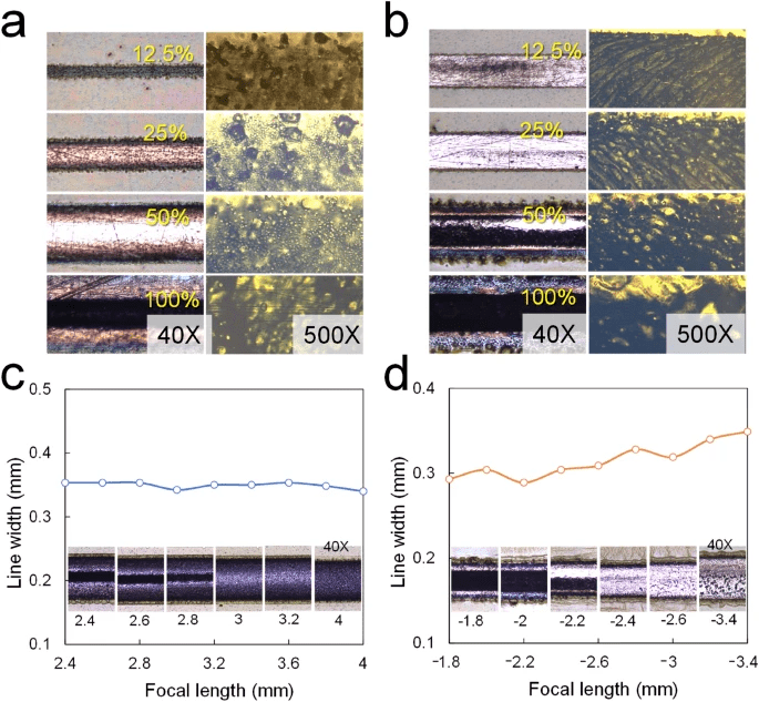 圖4:隨著輸入PWM信號比從12.5到100%變化的圖版銅顯微鏡圖像:(a)在LFL和4 mm/s掃描速度下形成的銅線,(b)在SFL和4 mm/s掃描速度下形成的銅線。在各種SFL和LFL上形成的Cu模型的顯微鏡圖像和線寬,以尋找適當的焦距以最小化缺陷:(c)焦距(LFL)從2.4到4 mm, (d)基于RFL的焦距(SFL)從?1.8到?3.4 mm。請注意,Cu模型是在38% PWM輸入和4 mm/s掃描速度下獲得。