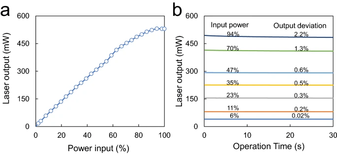 圖3:激光輸出功率隨輸入信號變化的特性:(a)激光輸出隨PWM輸入比變化;(b)在“開”狀態下,激光輸出在不同PWM輸入比下的波動。