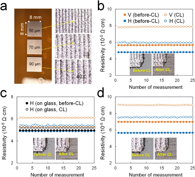 圖7:在不同掃描間隙(50、70、90 μm)和SFL下形成的Cu方形模型的電阻率:(a) PI上Cu方形(8 × 8 mm2)模型的相機圖像及其顯微鏡圖像,(b) 50 μm掃描間隙的電阻率曲線,(c) 70 μm掃描間隙,(d) 90 μm掃描間隙。請注意,電阻率圖包括相對于激光掃描方向的垂直/水平方向的電阻率對比以及每種情況清洗前后的電阻率對比。
