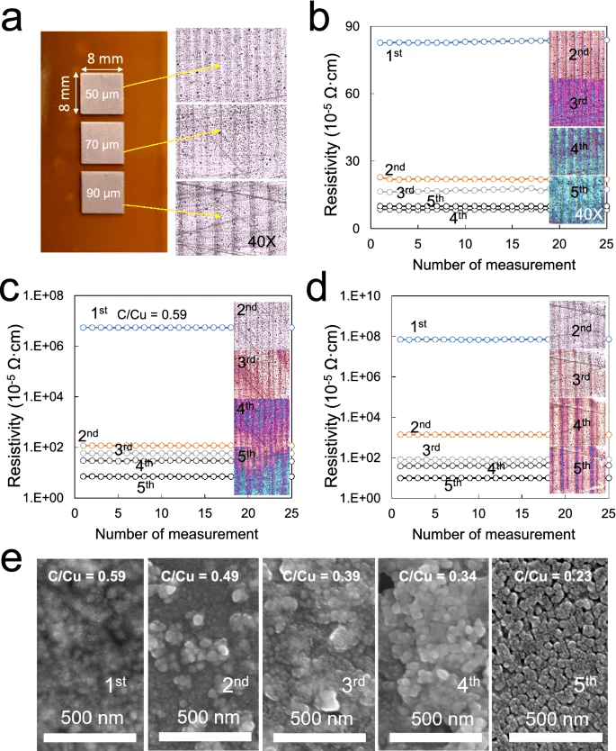 在確定激光功率、掃描速度和焦距的適當條件下,測量了8 × 8 mm2方形Cu圖在不同激光掃描間隙(50、70和90 μm)下的電阻率。圖6a顯示了燒結過程中形成殘碳條狀線的Cu方形模型的相機圖像。在LFL上進行一次激光掃描,在50 μm處可見約830 μΩ·cm,在70 μm處可見約5.4 Ω·cm,在100 μm處可見約4.9 Ω·cm。為了固定這種高電阻率,并進一步檢驗激光處理效果,對銅模型進行了再次激光處理。進一步的激光掃描逐漸降低了Cu圖的電阻率,降至70 μΩ·cm(圖6b)。對于70和90 μm線掃描間隙,電阻率急劇下降到約70 μΩ·cm(圖6c-d)。圖6e中70 μm模型的掃描電鏡圖像表明,隨著激光掃描時間的延長,Cu的粒徑逐漸增大。根據該模型的EDX分析,C/Cu比值也隨著激光掃描次數的增加而降低。
