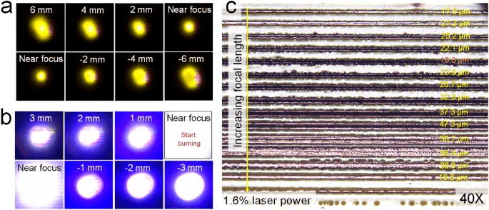 圖2:聚焦激光束:(a)使用USB相機找到激光焦距,(b)在1.6%脈寬調制(PWM)輸入信號下使用裸PI薄膜上的燃點確定焦距,(c)使用G-code程序(掃描速度為1mm /s和2% PWM)通過在不同焦距上形成的Cu模型確定焦距。