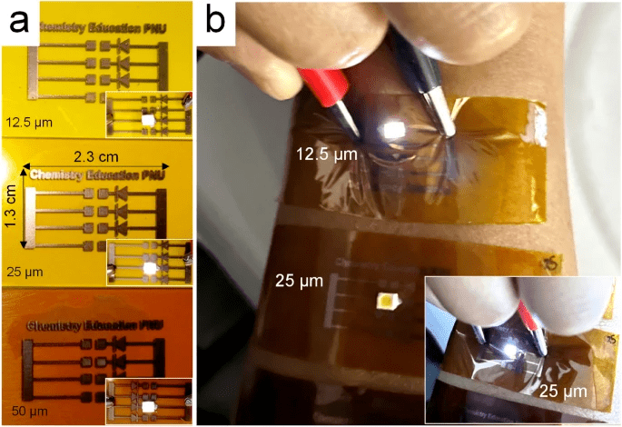 圖9:為測試與LED的導電連接而設計的各種Cu模型:(a)在附著在玻璃板上的不同厚度(12.5、25和50 μm)的PI薄膜上形成的Cu模型;(b)在附著在手臂皮膚上的PI薄膜上的Cu模型上工作的LED。