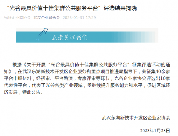 1月31日,武漢東湖新技術開發區企業家協會公布“光谷最具價值十佳集聚公共服務平臺”,武漢·中國光谷激光行業協會成功入選。 武漢東湖新技術開發區企業家協會為了推動...