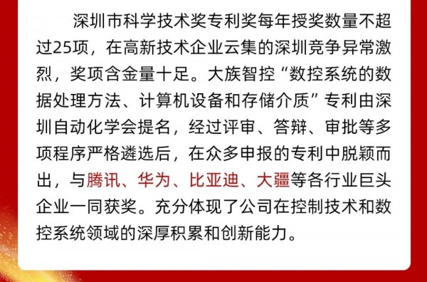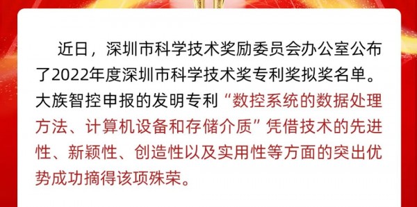 喜訊!大族智控榮獲深圳市科學技術獎專利獎與比亞迪、華為、大疆、騰訊等25家科技巨頭同獲殊榮,十余年潛心鉆研數控技術,為中國激光設備智能升級持續發力。