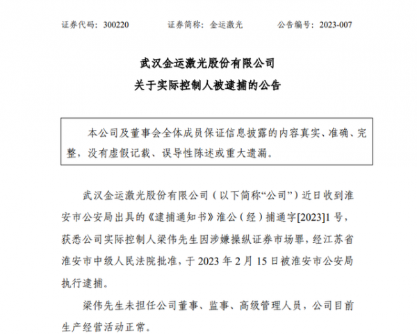 2月16日晚間,金運(yùn)激光(SZ300220,股價(jià)12.66元,市值19.14億元)公告稱,公司近日收到淮安市公安局出具的《逮捕通知書》,獲悉公司實(shí)際控制人梁偉因涉嫌操縱證券市場(chǎng)罪,經(jīng)江蘇省淮安市中級(jí)人民法院批準(zhǔn),于2月15日被淮安市公安局執(zhí)行逮捕。