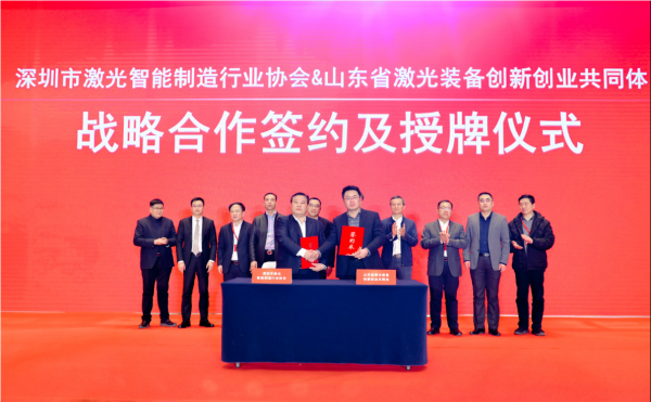 首先簽約的雙方為廣東省激光行業協會、山東激光學會。在莊嚴熱烈的氣氛中,甲方簽約代表——廣東省激光行業協會秘書長、《激光制造商情》總編邵火,以及乙方簽約代表——山東激光學會秘書長孔祥和分別在戰略合作協議上簽字,并完成了授牌。據了解,本次合作雙方共同自愿發起結對合作關系,雙方將通過建立協會的互訪機制、發起雙方會員的互動機制、啟動合作機制、搭建宣傳互動機制等幾個方面的合作,實現優勢互補、強強聯合、催生“1+1>2”的倍增效應,為雙方社團日后的發展注入新活力,并高質量服務政府、服務企業、服務廣東和山東兩地的經濟社會發展。合作雙方將以更好的服務政府,更好的服務會員為目標,具體通過走訪、交流,通過教育、沙龍、學術交流、科學普及、科學培訓等形式,增強了解,加深友誼,抱團取暖,共同發展;促進信息共享、資源倍增、項目落地,實現效益最大化。深圳市激光智能制造行業協會攜手山東激光裝備創新創業共同體