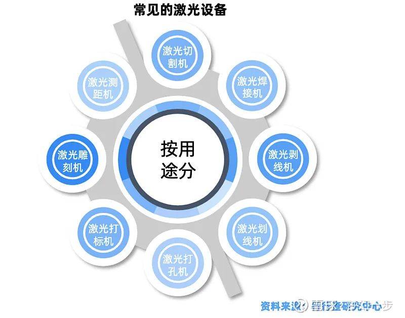 歷經(jīng)多年的發(fā)展,激光技術(shù)已廣泛應(yīng)用于各行各業(yè),形成了完整的產(chǎn)業(yè)鏈。激光產(chǎn)業(yè)鏈上游主要包括光源材料、光學(xué)元器件及其他組成激光器的材料 ; 中游主要為各種激光器、機(jī)械系統(tǒng)、數(shù)控系統(tǒng),其他例如電源、散熱器、傳感器、分析儀、防護(hù)鏡等 ; 下游則是成套的激光加工設(shè)備,如激光切割機(jī)、激光焊接設(shè)備、激光打標(biāo)機(jī)等。激光產(chǎn)業(yè)鏈的終端應(yīng)用領(lǐng)域涉及交通、醫(yī)療、電池、家電、商業(yè)用途等。