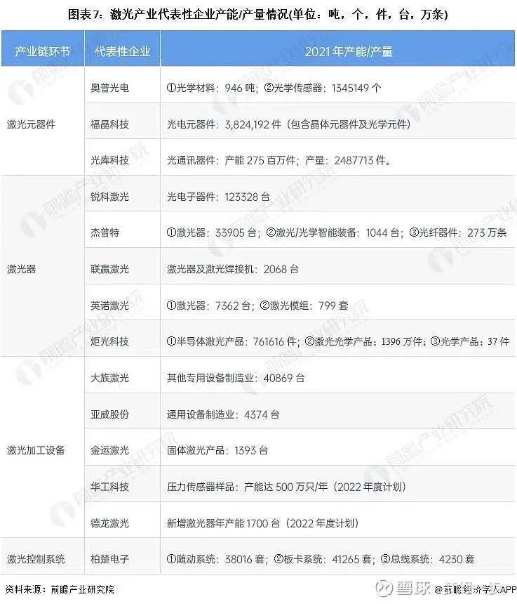 目前,布局了激光業(yè)務(wù)上市企業(yè)中,激光元器件中福晶科技光電元器件產(chǎn)量最高,超 382 萬件 ; 激光器中銳科激光領(lǐng)先,光電子器件超 123 萬臺 ; 激光加工設(shè)備中大族激光達(dá) 4 萬臺 ; 未來華工科技和德龍激光產(chǎn)能將大幅提升 ; 激光控制系統(tǒng)中柏楚電子控制系統(tǒng)高達(dá) 7.9 萬套。激光產(chǎn)業(yè)產(chǎn)業(yè)鏈上的其它代表性企業(yè)產(chǎn)能 / 產(chǎn)量情況如下: