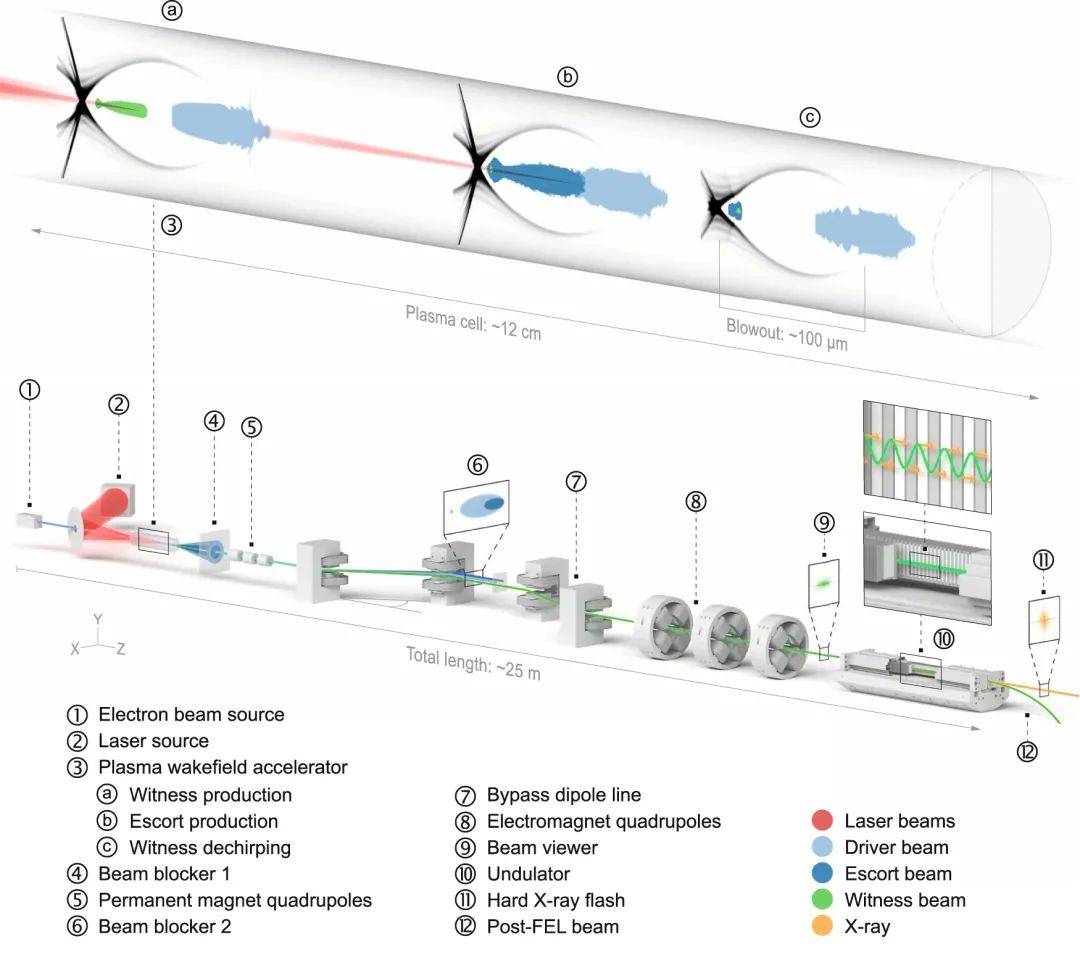 整體設置如圖1所示,由三個主要構建塊組成:等離子體加速器,其中產生超亮電子束,光束傳輸級,其中超亮電子束被捕獲、隔離和傳輸,以及波動器,產生 X 射線脈沖。