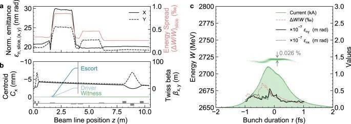 文中,研究人員展示了從頭到尾的模擬研究,如何從PWFA中產生具有前所未有的發射度和亮度的亞飛秒電子束,如何在不損失電荷的情況下傳輸它們,并在幾nm-rad級的發射度下完全保存,以及如何利用這些超亮光束進行阿秒埃級X-FEL脈沖生產。
