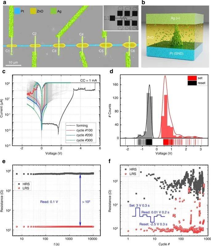 圖4a顯示了一個集成的1×6交叉memristor陣列,ZnO線寬從1.5μm (C1)增加到1.8μm (C2), 2.2μm (C3), 2.6μm (C4), 3.0μm (C5),到3.5μm (C6),線寬為0.6μm的單根Pt線上連接到激光打印接觸墊L1。6根ZnO棒材沿Pt線等距打印,間距為15 μm,并通過線寬為~0.72 μm的銀線層連接到接觸墊上(見圖4a所示整體結構)。