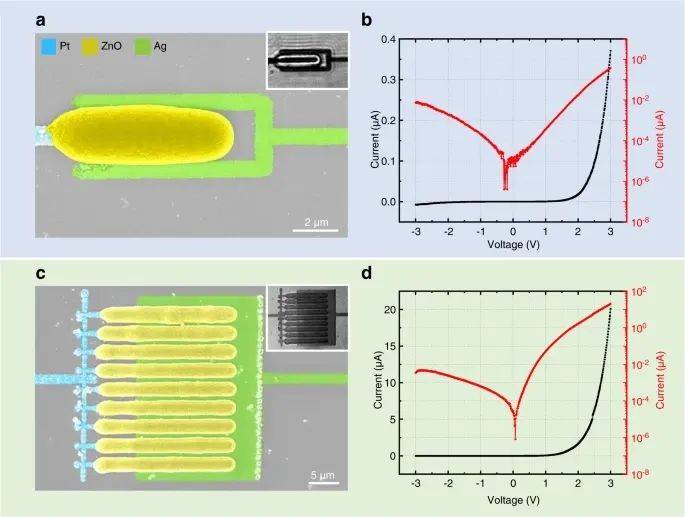 作為激光打印金屬和半導體的新研發,研究人員考慮了橫向配置的Pt-ZnO-Ag二極管。如圖3所示,二極管由一根鉑線(~0.8 μ m寬)、一根銀線(~0.8 μ m寬)和中間的氧化鋅棒組成。通道長度,即Pt和Ag之間的橫向間距為~0.7 μ m。它是由ZnO棒的橫向寬度決定的。測量得到的電流-電壓特性如圖3b所示。