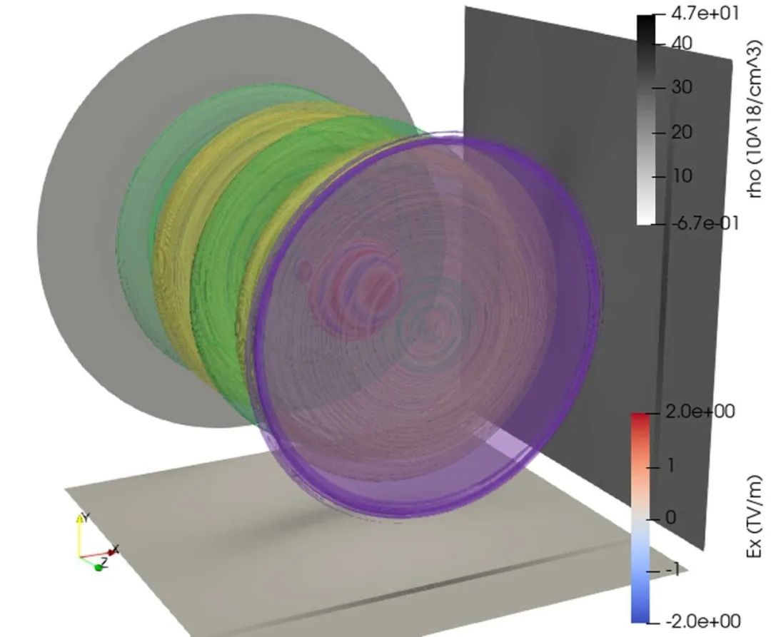 電子束(紫色)后面的尾流以及光脈沖(藍色和紅色條紋)如何在其后面沖浪的3D模擬。等離子體尾流以交替黃色表示沒有電子,綠色表示電子密度峰值。當光脈沖位于該邊界上...