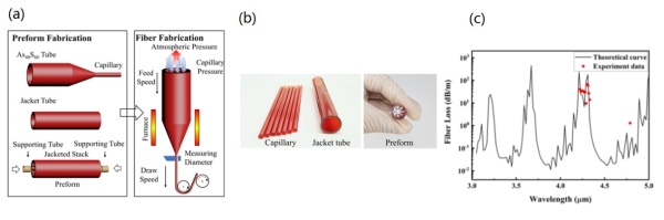 (a)堆積拉制法和雙路氣壓控制技術(b)光纖預制棒 (c)光纖的理論損耗與實測損耗
