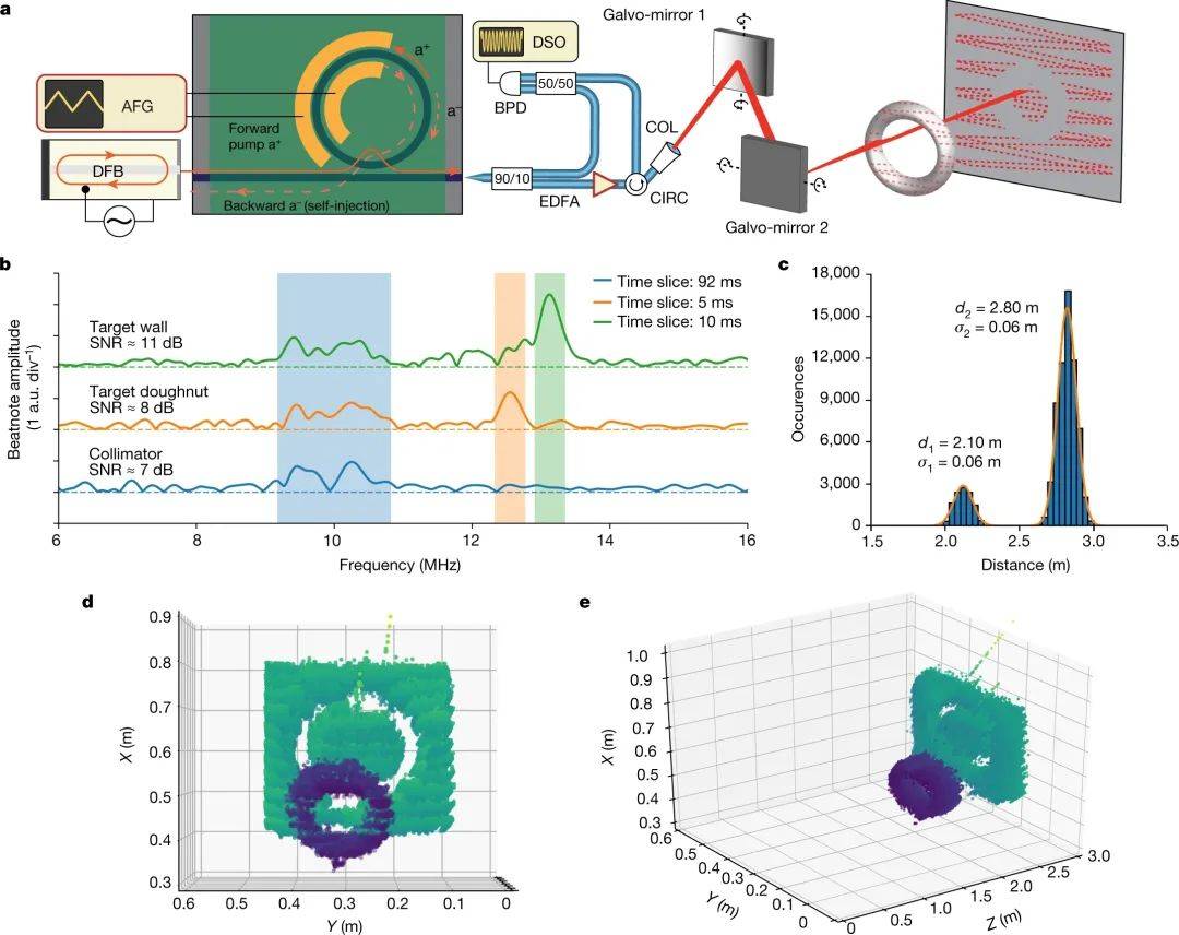 這種方法產(chǎn)生了一種具有低頻噪聲(衡量激光頻率穩(wěn)定性的指標)的激光,同時具有快速的波長調(diào)諧——這兩種特性都是用于光探測和測距(激光雷達)應用的激光器的優(yōu)良品質(zhì)。然后研究人員進行了光學測距實驗,用激光高精度地測量距離。