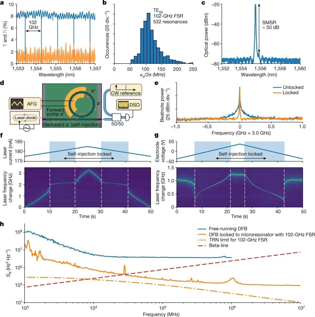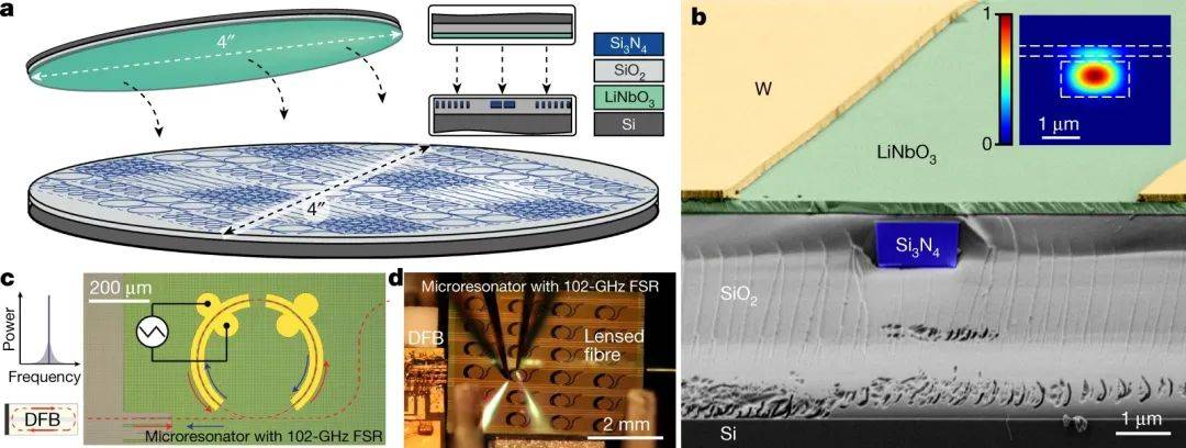 研究人員的平臺基于超低損耗Si3N4光子集成電路與薄膜LiNbO3的異質(zhì)集成,通過在晶片級直接鍵合,與之前演示的芯片級集成相比,具有8.5分貝/米的低傳播損耗,通過自注入鎖定激光二極管實現(xiàn)窄線寬激光。