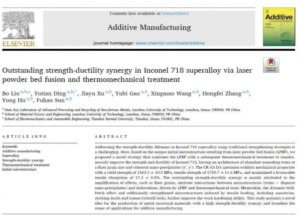 近日,省部共建有色金屬先進加工與再利用國家重點實驗室丁雨田教授科研團隊在激光增材制造鎳基高溫合金的孿晶界面調控研究中取得重要進展,研究成果以“Outstanding strength-ductility synergy in Inconel 718 superalloy via laser powder bed fusion and thermomechanical treatment”為題發表在國際工程技術領域TOP期刊《Additive Manufacturing》(IF:11.632/Q1)上。蘭州理工大學省部共建有色金屬先進加工與再利用國家重點實驗室為第一完成單位,合作單位為天水師范學院機電與汽車工程學院和鎳鈷資源綜合利用國家重點實驗室;劉博博士為第一作者,丁雨田教授為通訊作者。