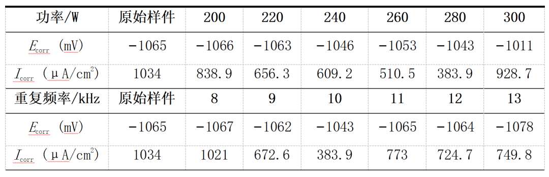 圖15為不同激光參數下測試出的動電位極化曲線(Potentiodynamic Curve),將試驗數據采用塔菲爾擬合(Tafel Fit)處理,得到表15所示的不同參數下樣件表面的自腐蝕電位(Ecorr)和腐蝕電流密度(Icorr)。自腐蝕電位高低反映了電化學腐蝕條件下,樣件的熱穩定特性。而腐蝕電流密度大小反映了發生電化學腐蝕的速率以及樣件表面產生點蝕現象的難易程度。