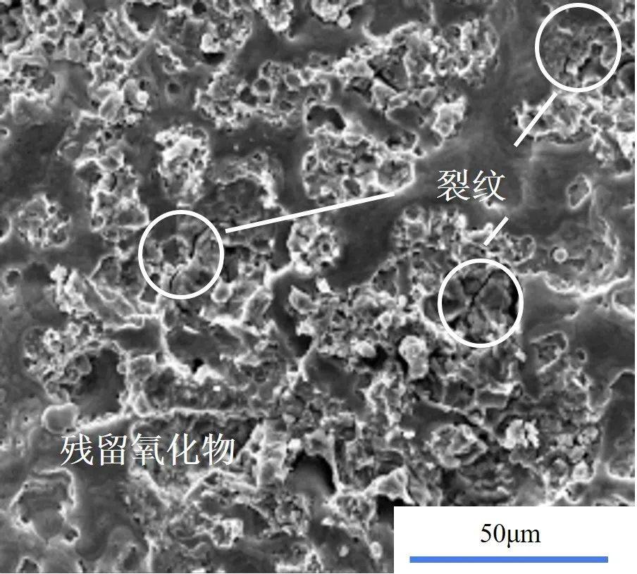當清洗過程中氧化層厚度較薄時,表面會出現較多裂紋,如圖3所示。這是由于更多的激光能量透過氧化層作用于基體表面,基體的線性膨脹系數遠大于氧化層,溫度變化引起其發生較大的熱膨脹,從而使基體和氧化層的界面處存在熱應力,導致氧化層產生較多的裂紋。