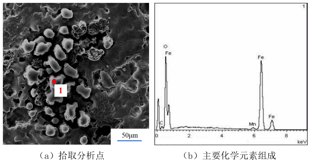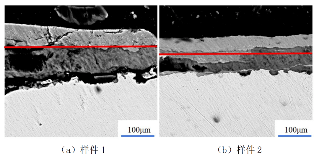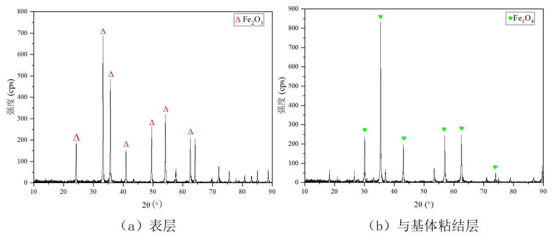 對于測試樣件的剖面方向,如圖6示。基體表層的不同污物成分間存在明顯的界限,即存在兩層不同成分的氧化層。進一步采用X射線衍射儀(XRD)對各層的化合物成分進行測定,存在外銹層和內銹層,即外銹層為稀疏的Fe2O3,內銹層為Fe3O4與FeO(少量)的混合物,工作狀態的差異會導致氧化層的致密程度等性質有所差異。