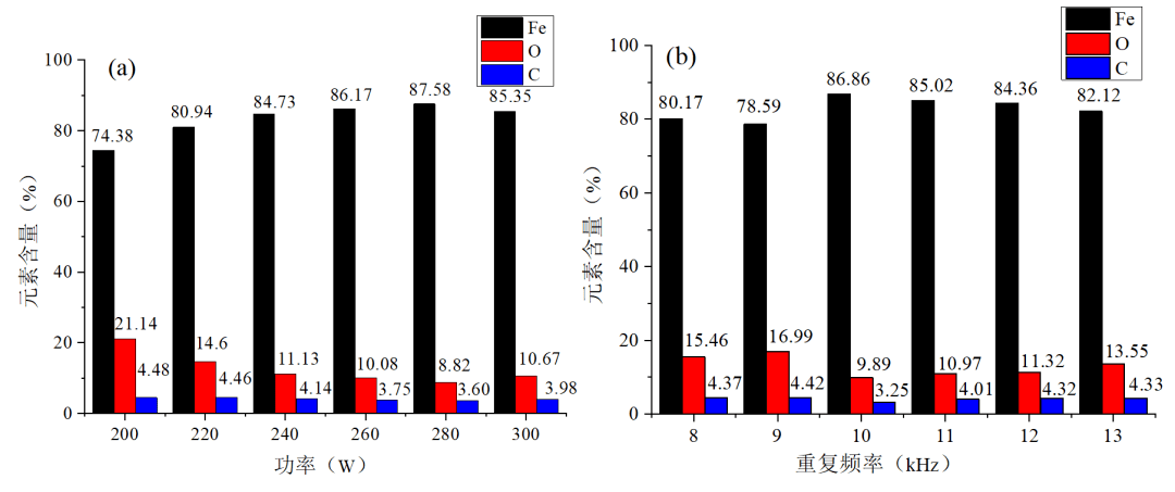圖13(a)為不同激光功率下Fe、O、C三種元素的相對含量。隨著的增加,Fe元素的含量呈現先上升后下降的趨勢,O元素含量呈現先下降后上升的趨勢,清洗過程中C元素含量基本保持不變。繼續升高功率,O元素含量最低為8.82%,Fe元素含量最高為87.58%,樣件清洗效果最好,清洗效率最高。激光功率繼續,Fe-O元素中O元素含量略有上升,證明此時激光處于過清洗狀態,樣件表面發生二次氧化現象,清洗效率有所下降。實際上,當重復頻率固定后,功率的變化代表了激光單脈沖能量的變化,單脈沖能量過高和過低都會對清洗效率產生不利影響。