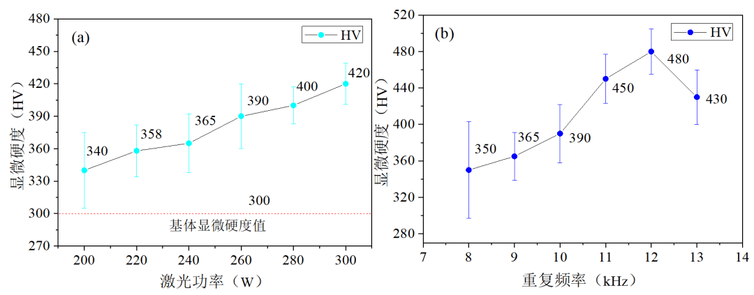 圖14 不同參數下顯微硬度變化規律(a)功率;(b)重復頻率;