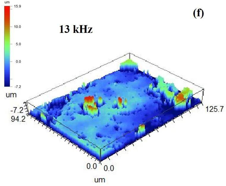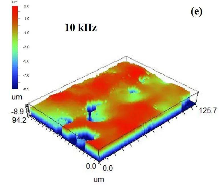 單因素實驗探究了不同激光功率、重復頻率(脈沖寬度)下,激光清洗前后樣件表面粗糙度的變化規律,如圖9所示。同時,圖10為典型參數下白光干涉儀測試樣件的3D形貌。