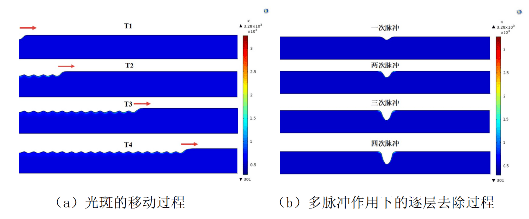 激光清洗銹蝕氧化物的過程實際上是依靠光斑的往復移動,當氧化物層溫度達到自身熔化或者氣化溫度時,氧化層材料會因相變發生熔化分解、氣化蒸發等效應,并實現逐層去除的過程,如圖1所示。