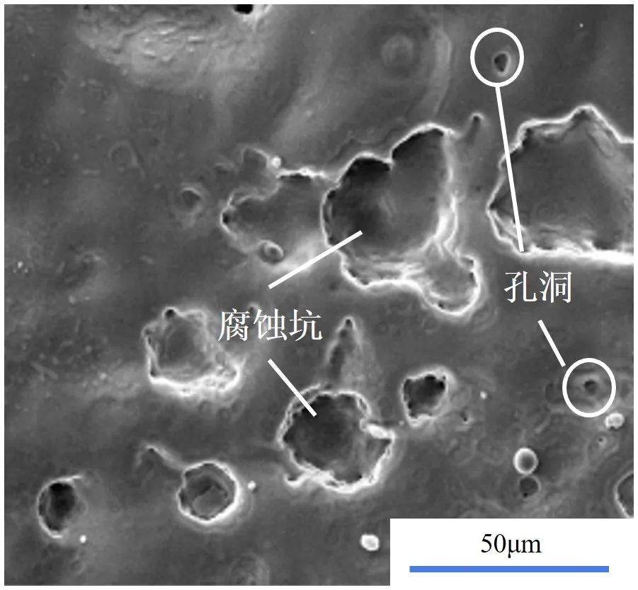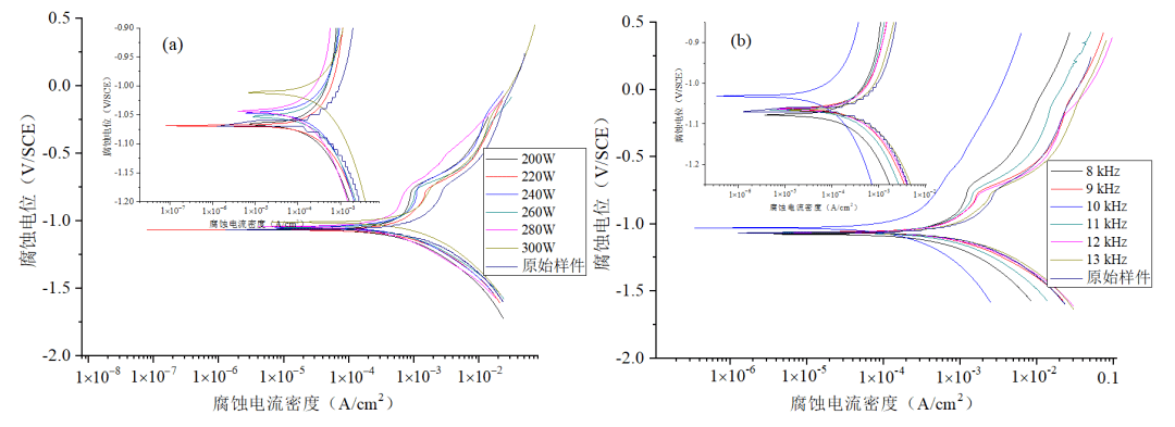 由圖15(a)以及表3可以看出,隨著激光功率的增加,極化曲線均呈現正向移動趨勢,自腐蝕電位逐步增大,即清洗后樣件表面的腐蝕動力小幅增強。腐蝕電流密度先減小后增加,表示樣件表面的抗腐蝕性能先增加后減小。激光功率增加,腐蝕電流密度最低為383.9,抗腐蝕性能最佳,此時極化曲線中鈍化區的鈍化平臺較寬,樣件的鈍化狀態較穩定。抗腐蝕性逐漸增加的主要原因為激光使樣件表面疏松銹蝕氧化物去除的同時,對基體會產生不同程度的熱影響,細化晶格,提高表面完整性,從而抗腐蝕性能得到改善。當功率最大時,由微觀形貌可知,熱累積量過高,表面出現燒蝕坑,熔融物增加,基體發生損傷,抗腐蝕性下降。