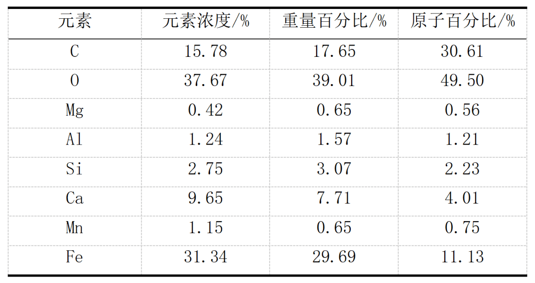 采用礦山機械銹蝕件作為試驗樣件,采用能譜分析儀(EDS)測定待清洗樣件表面主要的化學元素,測試樣件及主要化學元素組成如圖5及表2所示。