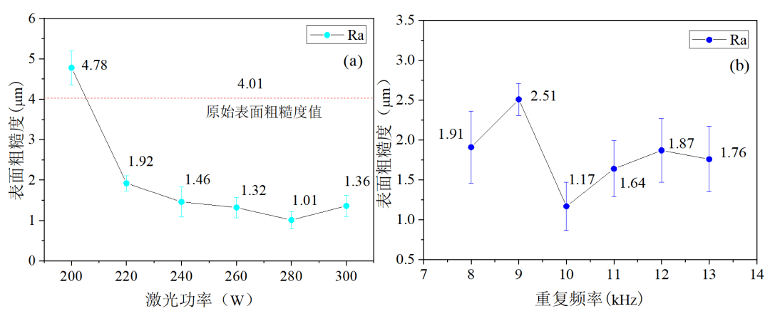 表面粗糙度隨重復頻率的變化規律如圖4-7(b)所示。可以看出,表面粗糙度值與重復頻率之間沒有明顯的規律,其主要原因為重復頻率的大小除了影響激光的能量密度外,在相同振鏡周期下,還與樣件單位面積內光斑的作用次數有關。
