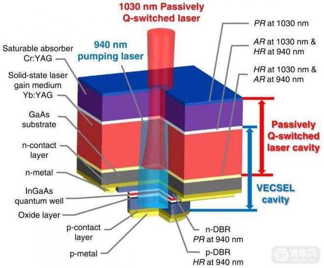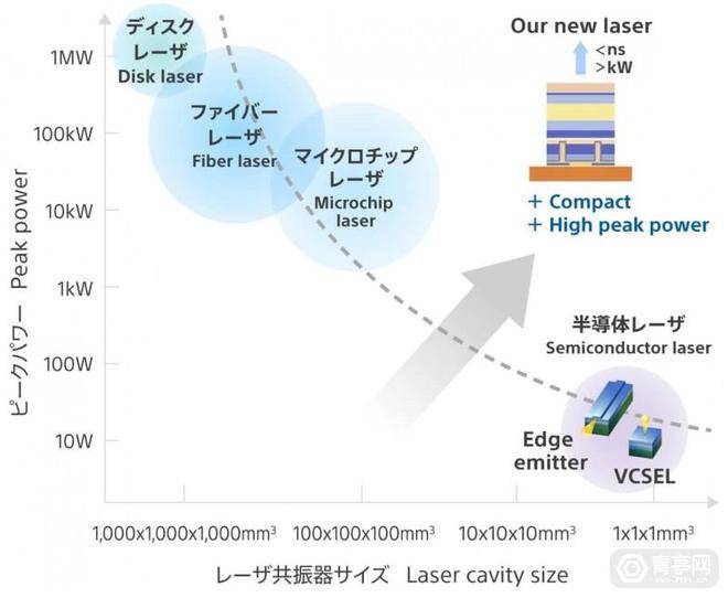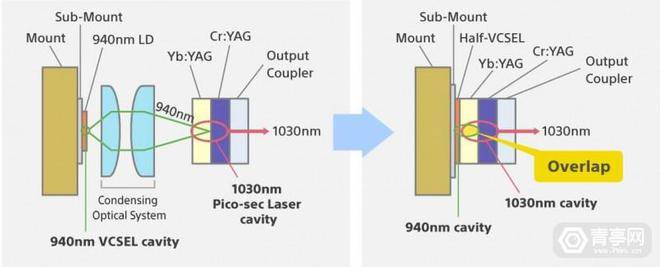 于是,索尼將固態(tài)鐳射與半導體激光方案融合,打造了一種更加緊湊、峰值功率更高的激光技術。這項技術的核心是一種由固態(tài)和半導體激光器組成的單片激光器,以及將VCSEL(垂直腔面發(fā)射激光器)作為激活光源,并將VCSEL和固態(tài)鐳射器(被動調Q激光)的空腔重疊。