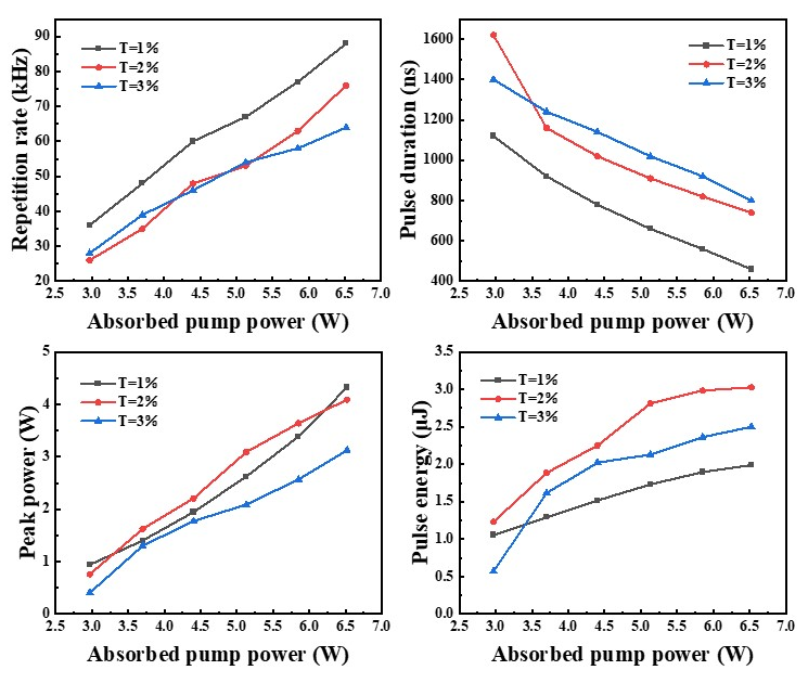 研究團隊采用提拉法生長了Tm:GdScO3晶體,晶體直徑超過40 mm。該晶體屬于具有光學各向異性的正交晶系結構,為了研究晶體的偏振光學性能,測試了晶體的偏振吸收和發射光譜。采用不同切向的晶體,進行了連續激光實驗,實現2 W的連續激光輸出功率,斜效率為28.4 %,激光與增益光譜的偏振特性相吻合。與進一步青島科技大學合作,利用SnS2二維材料作為可飽和吸收體,首次實現了Tm:GdScO3晶體的調Q脈沖輸出,同時也是SnS2作為2微米波段激光可飽和吸收體的首次實驗驗證。脈沖持續時間在輸出鏡透過率1%,2%,3%時,脈寬分別為460 ns,740 ns,800 ns,相應的單脈沖能量分別為1.99 μJ,3.03 μJ,2.50 μJ,峰值分別為4.32 W,4.09 W,3.13 W。