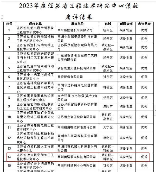 2023年3月31日,常州市科學技術(shù)局發(fā)布了《關(guān)于2023年度江蘇省工程技術(shù)研究中心績效考評結(jié)果的公示》,英諾激光全資子公司常州英諾激光科技有限公司經(jīng)過材料申報、常州市科技局形式審查、專家評審、盡職調(diào)查等流程,從全市抽查的155家省級工程技術(shù)研究中心中脫穎而出,績效考評獲得“優(yōu)秀”認定,現(xiàn)已完成公示。