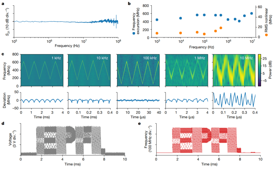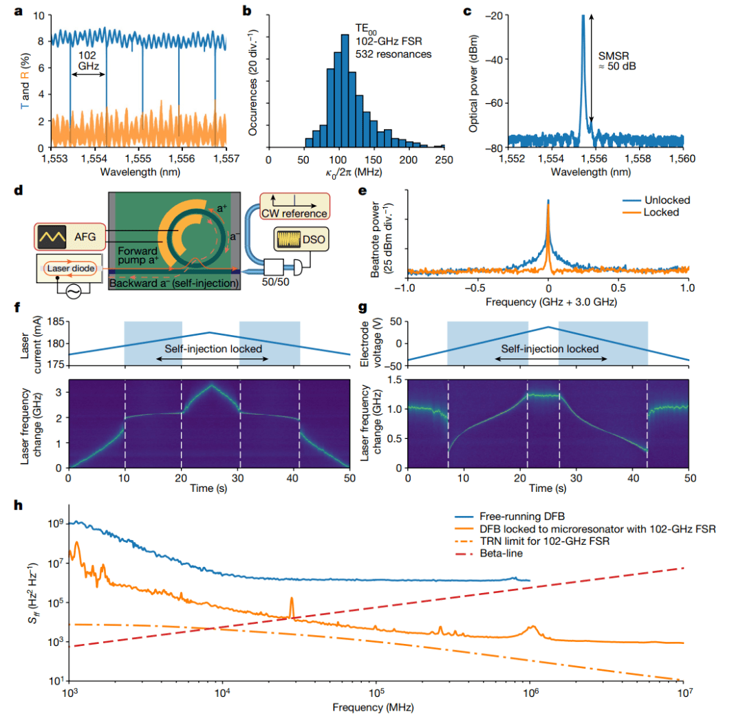 為了制造激光器,該團(tuán)隊(duì)在EPFL制造了基于氮化硅的光子集成電路,然后在IBM將其與鈮酸鋰晶圓結(jié)合。該平臺(tái)基于超低損耗Si3N4光子集成電路與薄膜LiNbO3的異質(zhì)集成,通過在晶片級(jí)直接鍵合,與之前演示的芯片級(jí)集成不同,具有8.5B/m的低傳播損耗。通過自注入鎖定到激光二極管,實(shí)現(xiàn)了窄線寬激光(固有線寬為3千赫茲)。諧振腔的混合模式允許其以12 PHz/s 的速度進(jìn)行電光激光頻率調(diào)諧,其在高線性度和低遲滯的同時(shí),可保持窄線寬。